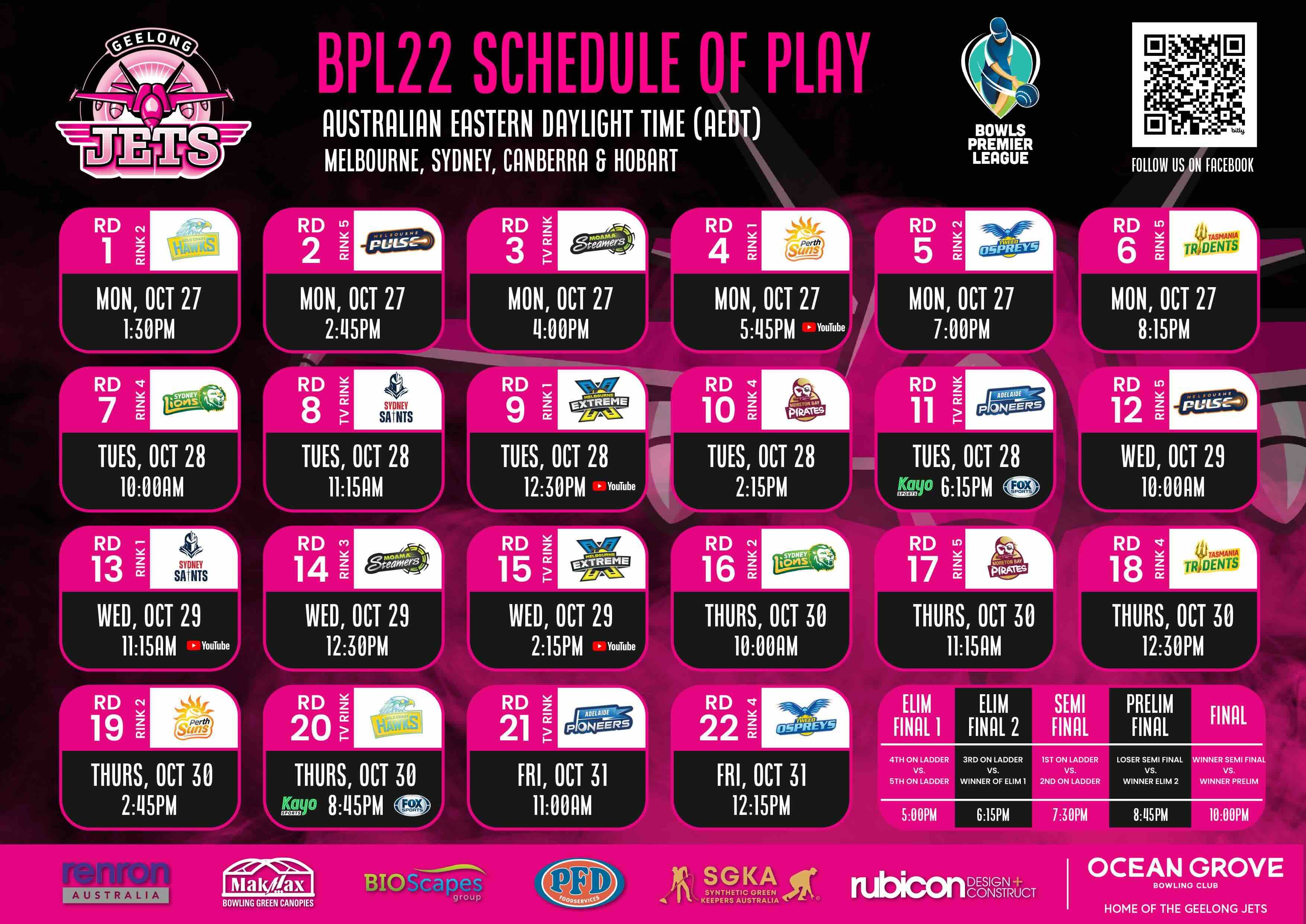 We’re making it easier for you to keep up with every Jets game, wherever you are. Our BPL22 Schedule of Play is now available, with game times listed with Australia’s Eastern time zones, as well as New Zealand Daylight Time (NZDT) and Greenwich Mean Time (GMT) for our fantastic fans in Scotland and across the UK.